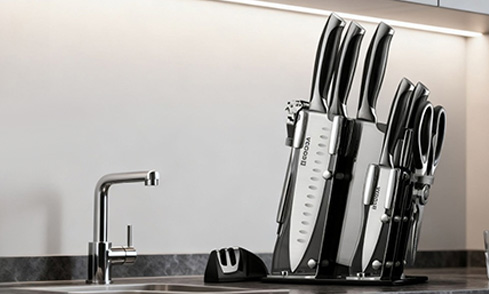 GOODA 9-teiliges Chefmesser-Set aus Edelstahl mit drehbarem Acryl-Messerblock, scharf, antihaftbeschichtet, Messerblock-Set, für die Küche, mit Schärfer, zum Schneiden, Würfeln, Hacken